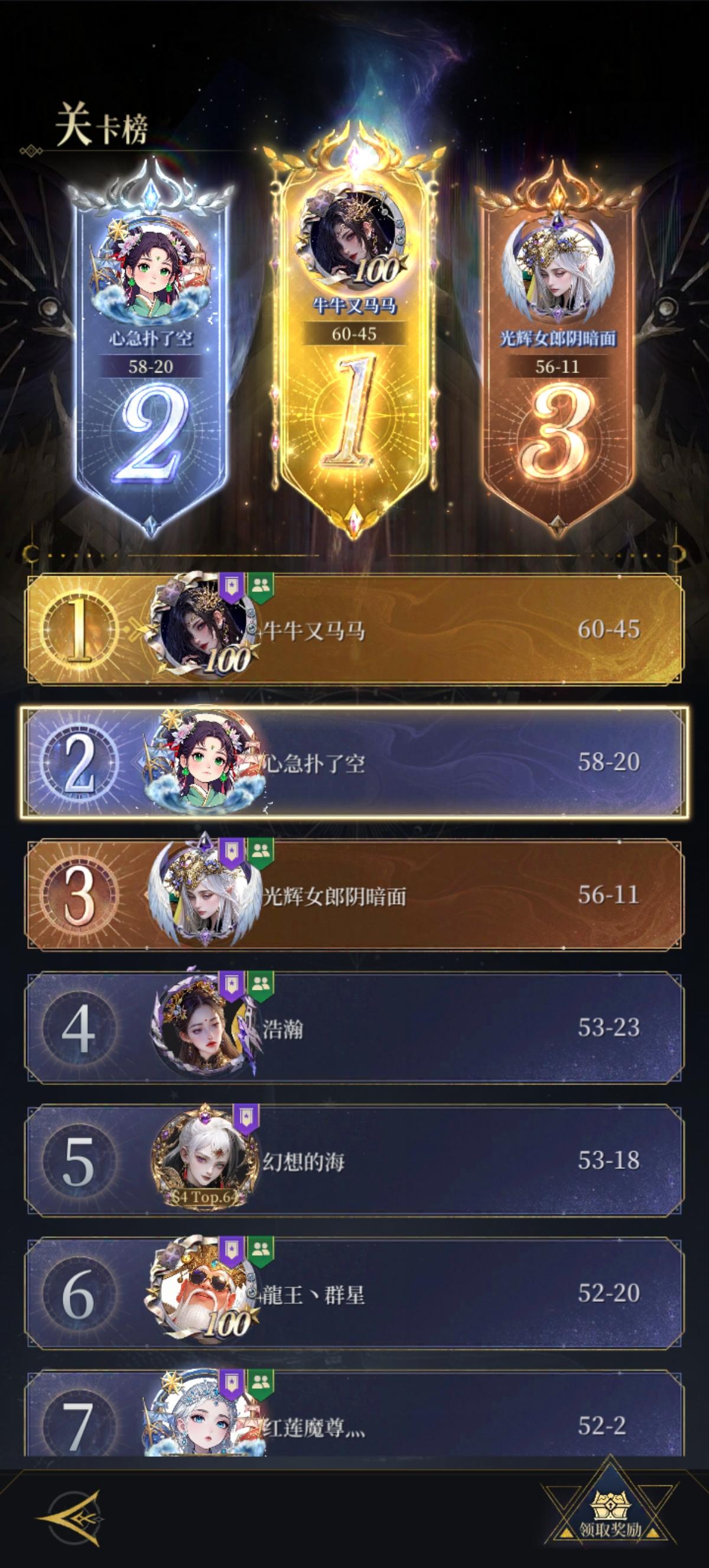 有人质疑,你是不是刷了,你是不是很肝,你是不是在人少区吃了资源。我刷没刷目前也只有8个神5,金色图腾才2个三级,钻石少的可怜。而且我在苹果3区,所有的排名活动都捞不到好名次,高阶角斗场进不了前8。宙斯哪吒也借不到,唯一借了大佬一次哪吒过500层,半天没还,大佬私我让我还,我没看到,结果把我好友删了,从那以后我都不借宙斯和哪吒了。所以通关57章真没想象中的难。搭配好过图很快的,下面言归正传。我只以