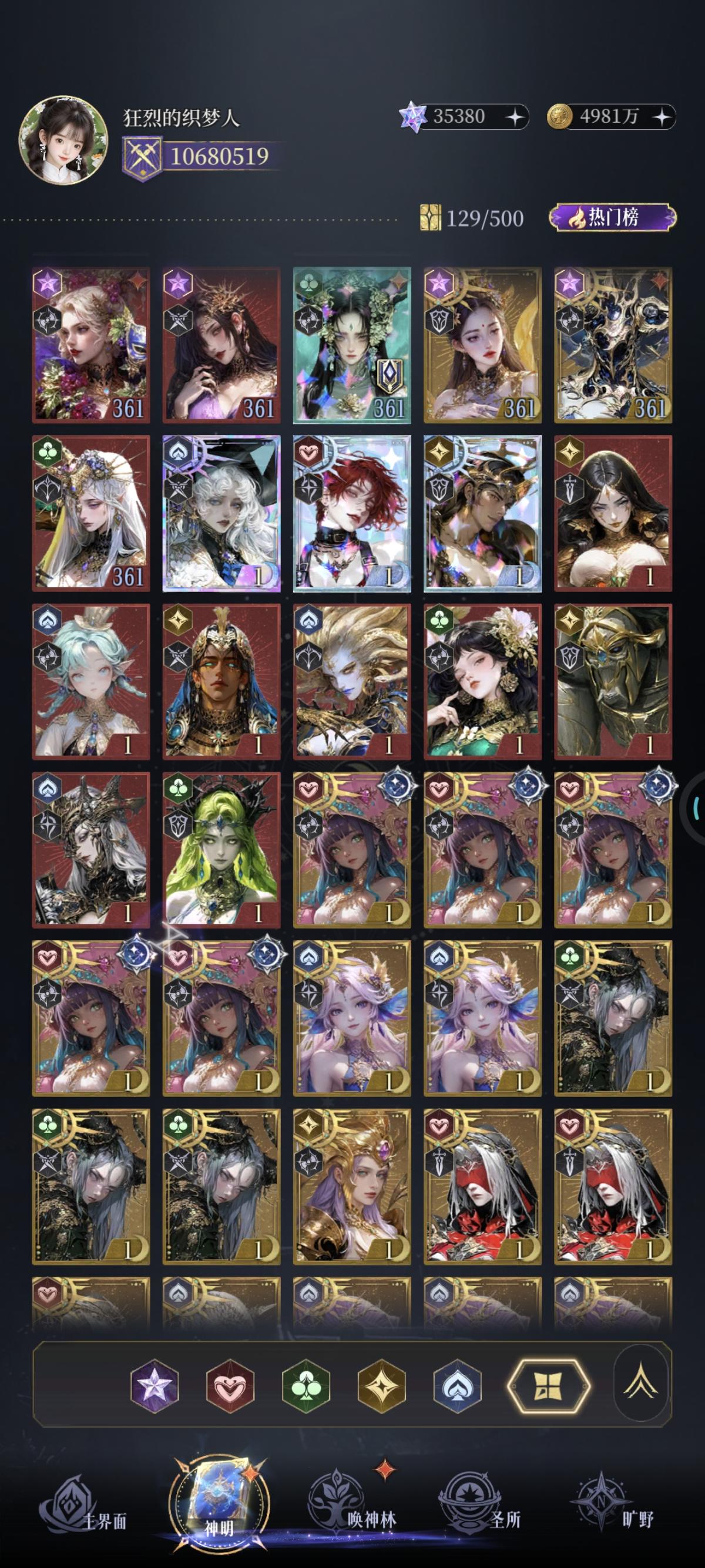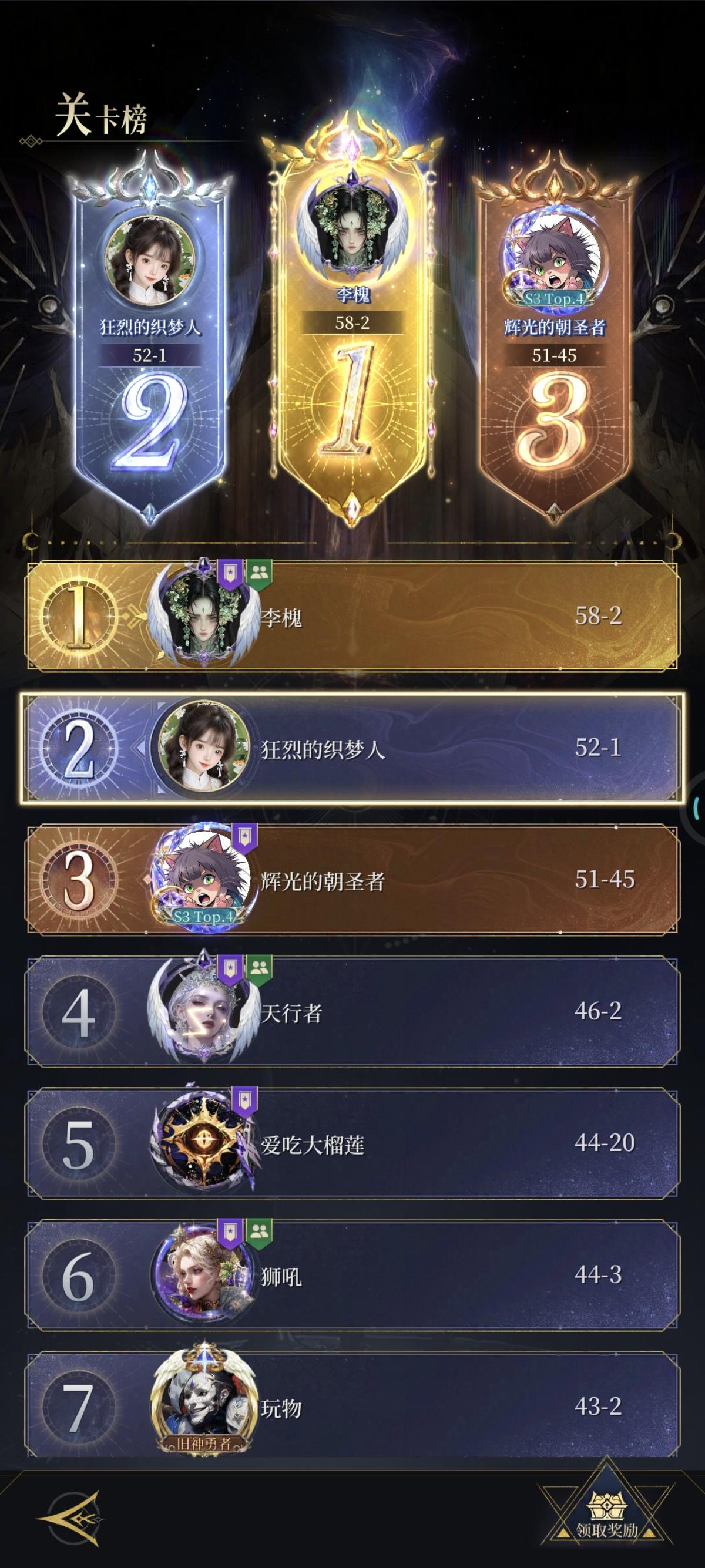 有人质疑,你是不是刷了,你是不是很肝,你是不是在人少区吃了资源。我刷没刷目前也只有8个神5,金色图腾才2个三级,钻石少的可怜。而且我在苹果3区,所有的排名活动都捞不到好名次,高阶角斗场进不了前8。宙斯哪吒也借不到,唯一借了大佬一次哪吒过500层,半天没还,大佬私我让我还,我没看到,结果把我好友删了,从那以后我都不借宙斯和哪吒了。所以通关57章真没想象中的难。搭配好过图很快的,下面言归正传。我只以