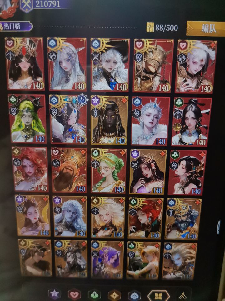 方块1:三相】图腾“金色三角形那个” 站位:摩摩斯,三相,雨神,月老,巨蟹座 三相刚需30神器,不然打不动 摩摩斯10神器 【方块2:宙斯】图腾金色花 站位:普罗米修斯,酒神,宙斯,财神,女娲 我的酒神和女娲都是单卡,只要宙斯练度越高越好,绝世就能用 财神建议神器20,普罗米修斯有条件10 【红桃队:海蛇风】图腾蓝色攻/紫复活 站位:波塞冬,狗头,蛇,风女,倪克斯 这队需要疯狂
