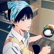 图中人物穿蓝色薄纱古装,黑色长发,半躺在草地上,背景是黑夜,空中漂浮粉色桃花花瓣,光线柔和朦胧