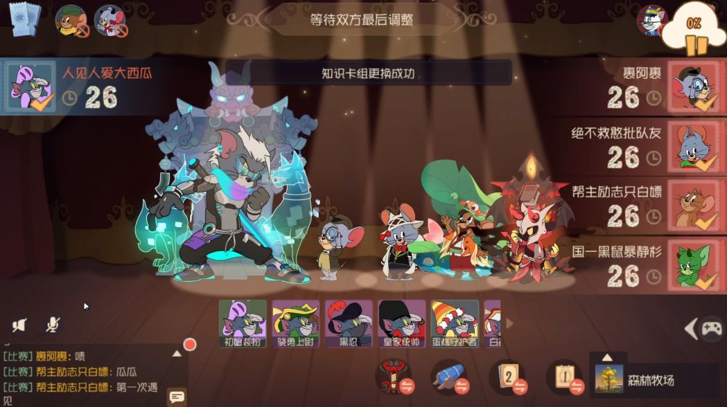 亲爱的小伙伴们, 这里是每天都在努力和大家一起进步的小不点!还记得上次大宝给我们带来的剑客泰菲教学吗?将保护队友视为己任的剑客泰菲可是小老鼠中的小英雄,所以很多小伙伴都十分喜欢这个角色。 今天来到《实战教学带你上分》栏目的是我们猫咪方的好朋友大西瓜。关于在森林牧场应该选择哪个猫咪,大西瓜表示自己很有发言权。快来看看大西瓜用侍卫汤姆在森林牧场打出的精彩操作,一起学习吧~ 森林牧场在咱们猫鼠世界中应该