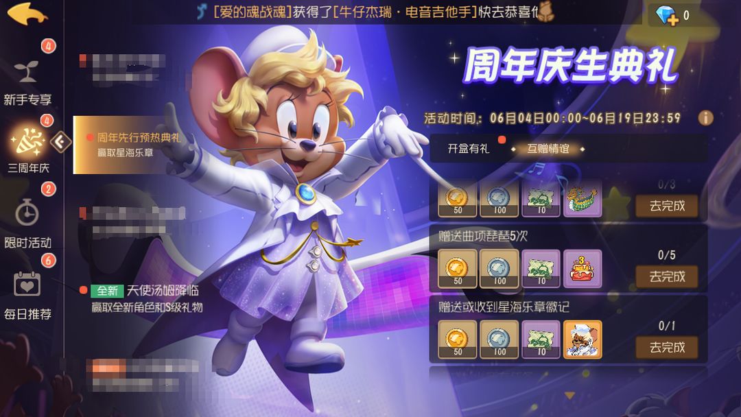 亲爱的小伙伴们, 我们的《猫和老鼠》手游3周年正在欢乐进行中,本周游戏中也会有不少3周年相关的热门活动供大家参与哦! 今天就让小不点先为小伙伴们盘点一下本周的周年热门活动吧~ 周年庆生典礼,赢取星海乐章 周年庆生典礼活动即将开始啦,想要赢取音乐家杰瑞的星海乐章皮肤吗?可不要错过机会了哦~ 活动时间:6月4日-6月19日 开盒有礼 周年皮肤彩饰自选礼盒:开启后可在往期周年庆皮肤彩饰和1000皮肤精华