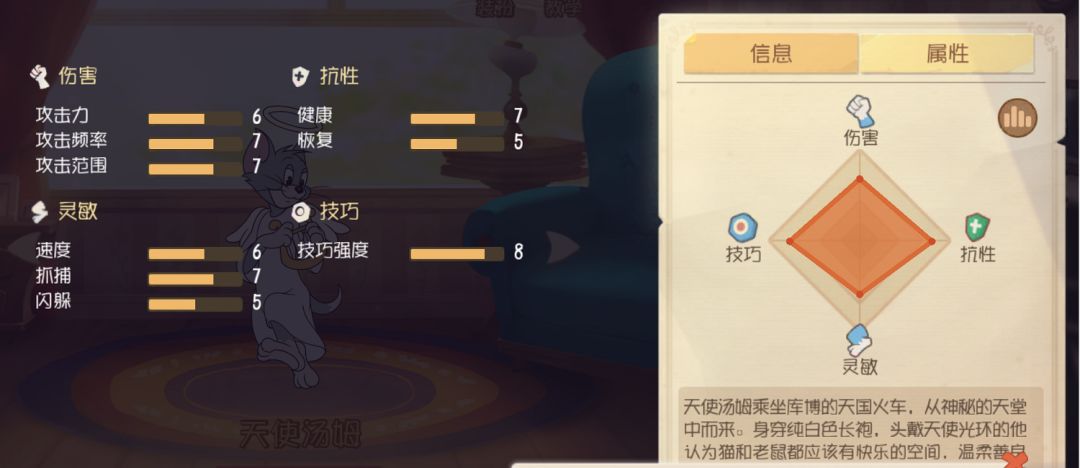 爱的小伙伴们, 天使汤姆和大家见面已经有一段时间了,不知道大家的上手情况都怎么样了呢? 小不点在细心研究了之后为小伙伴们带来了关于天使汤姆的攻略,快来一起看看分享一下各自的使用心得吧! 天使汤姆角色特性分析 天使汤姆的整体属性处于中游水平,但胜在他自身的快速追击以及中距离打击能力,是很容易靠近老鼠,并且快速进行击杀的哦!在整局游戏中,天使汤姆一般来说都不会缺少投掷道具,真可谓是行走的大炮呢~ 天使