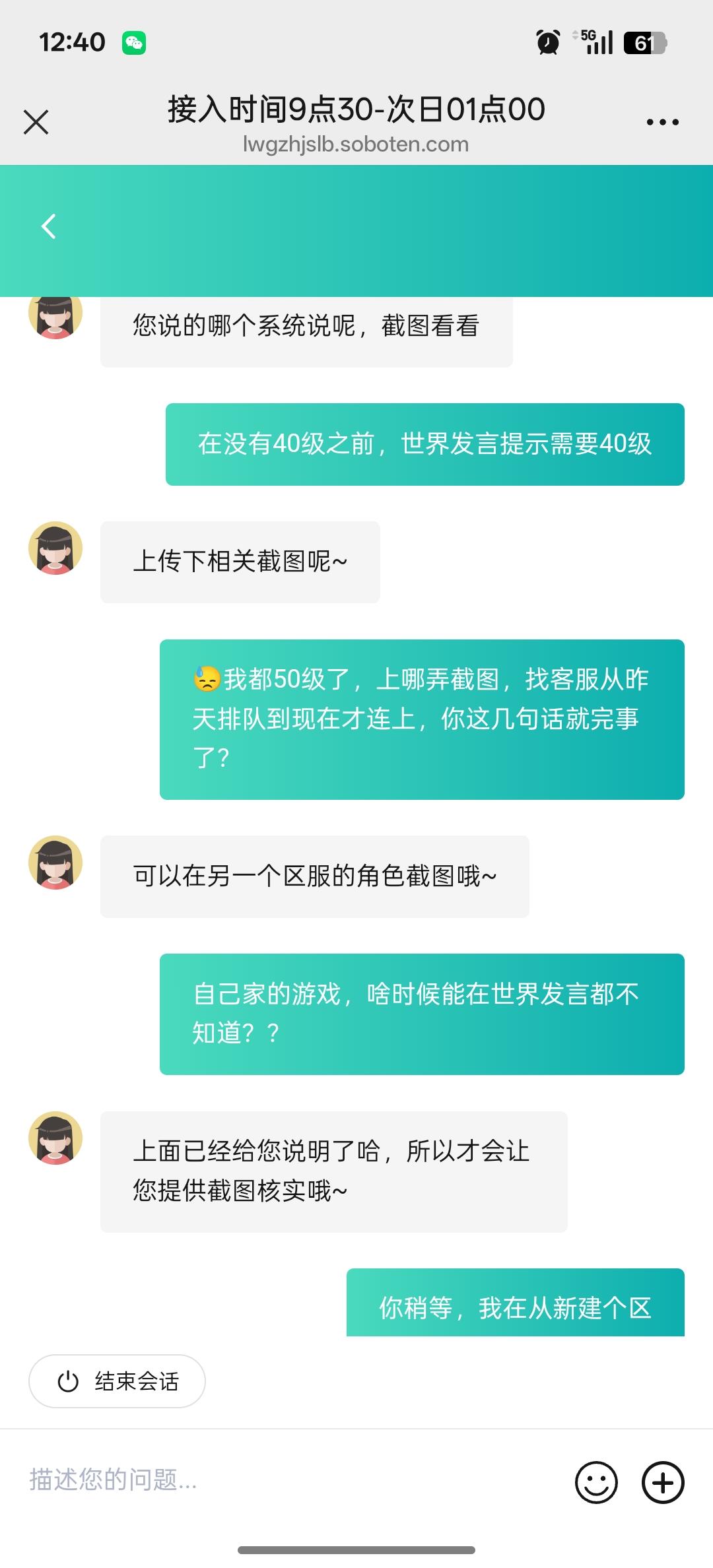 一个客服,连了两天连不上,好不容易接上了,我就问他为啥别人43级就能世界发言,我50级了,还提示禁言9年。一直回复我没满足条件。自己的游戏,40级能不能世界发言不清楚?还让我上传证据证明40级能发言??上传别人43能发言,然后就告诉我平台规则不一样。。。那你让我上传证据干嘛。操。连了两天客服,就这结果,谁敢玩没售后的游戏