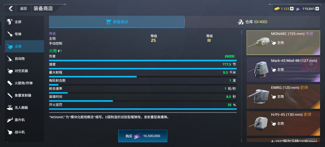 🎯 一、MONARC 155mm ---(德狙) ✅ 核心优势 1. 狙击炮性价比之王 - 零氪毕业装:无需金条,只需16,500,000晶片就可直接购买,平民主炮首选。 - 参数天花板:单发伤害 33,800,装填时间 5.95秒,最大射程 12.13公里,综合狙击效率全游戏顶尖。 #现代战舰 #现代战舰游戏
