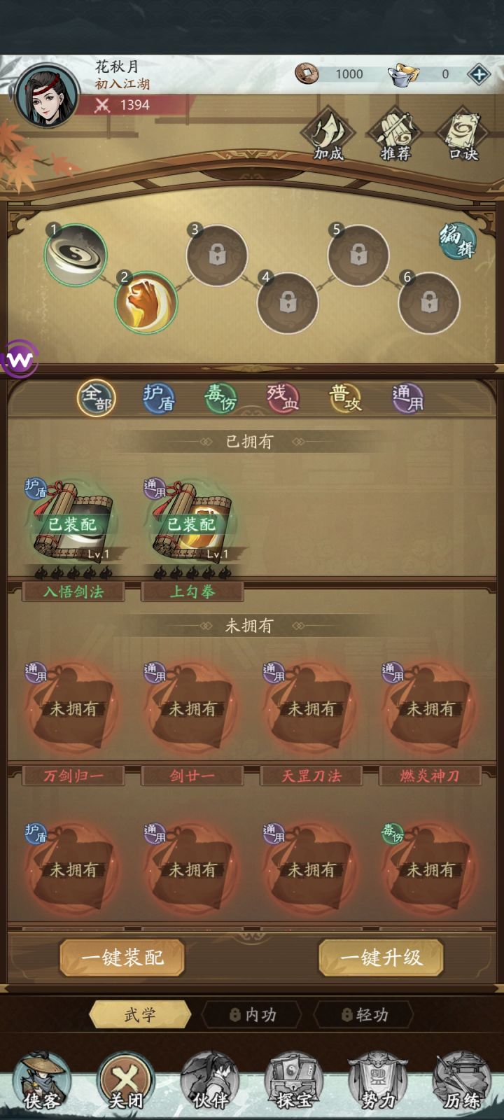 游戏按武学流派分为残血,毒伤,普攻,护盾,通用。残血氪金大佬较多,毒伤PVE刷图强一些,护盾PVP越战强一些,普攻都差不多,通用控制技能多一点。