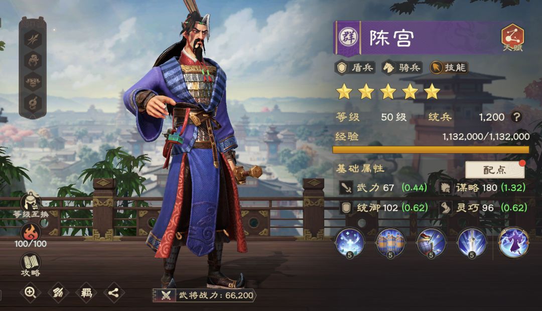 对于初期开荒而言,队伍除了输出能力外,减伤、续航机制也比较重要。陈宫自带续航,可为主将提供抗震,属于万金油类型的技能武将。今天给大家带来陈宫综合测评及配队推荐,小伙伴们可以做个参考。 一、武将简评 陈宫是紫卡,但谋略成长高达1.32,可通过主动技提供范围治疗、维持队伍兵力稳定。其被动还可提供增伤、抗震效果,简直就是技能体系首选副将(过渡使用,而且可以用较长时间)。 【技能解读】 1、怒气技:天地不