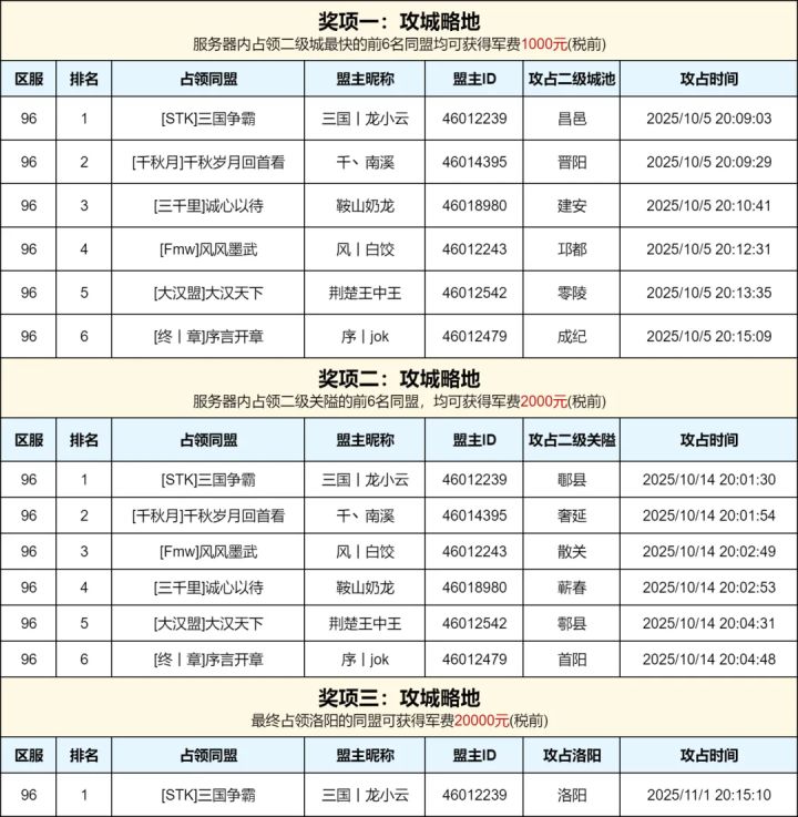 96区-国泰民安军费赏金赛获奖名单公示让我们恭喜这些同盟获得殊荣!同时,我们也将继续开启「赏金服」军费赏金赛请主公们持续关注后续开服公告!👇活动回顾👇阿武提示:1、奖项一、奖项二的盟主人选,以占领城池时的人选为依据;2、奖项三的盟主人选,以截止时间对应同盟的盟主人选为依据;3、军费奖励由盟主自行决定分配方式,同盟内部就上述奖励的偃武处置发生争议时,由盟主与同盟成员自行协商解决;4