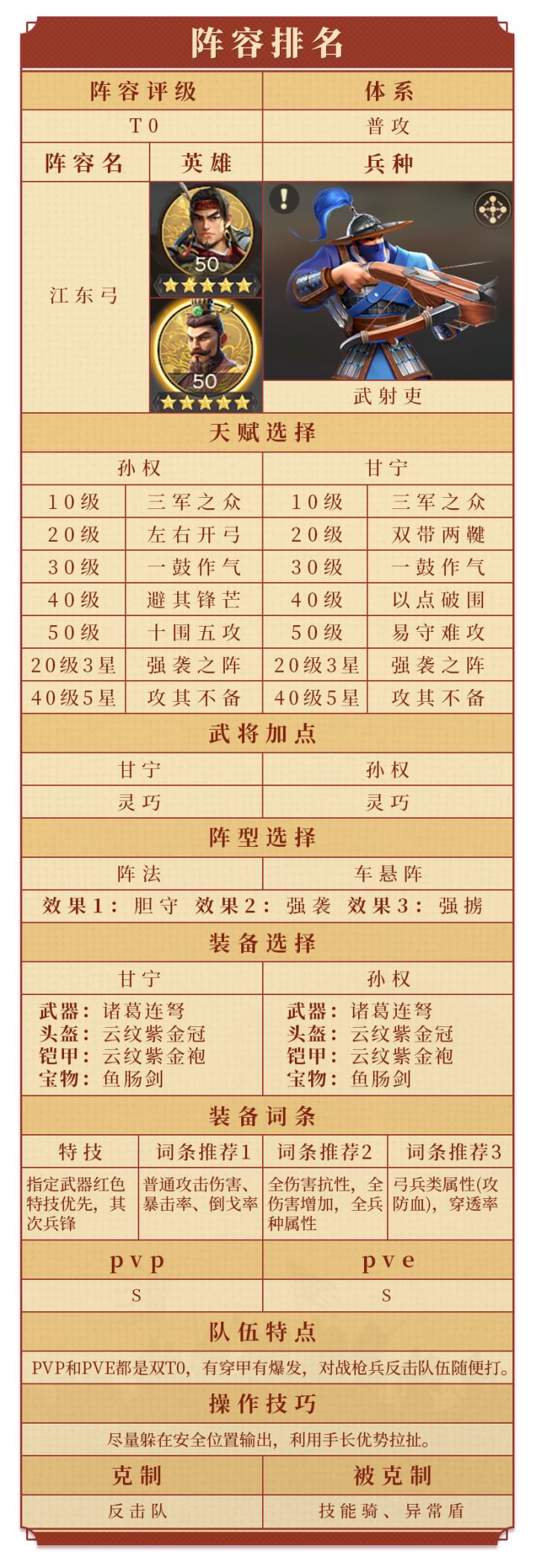 各位主公好,本篇攻略文章带来《偃武》中异常盾体系顶级队伍的精讲。从配将出发,全面讲解阵法、天赋、兵种、军政、加点、装备、装备词条等如何选择与培养,助力主公养成自身的顶级队伍,驰骋沙场。 队伍简介 本期为主公介绍的队伍是谋定天下盾,是S1最强的异常体系队伍,由诸葛亮和司马懿构成。其简单配图如下: 其特点如下: 1. 输出模式是利用灼烧和中毒等异常状态打出大量伤害。 2. 司马