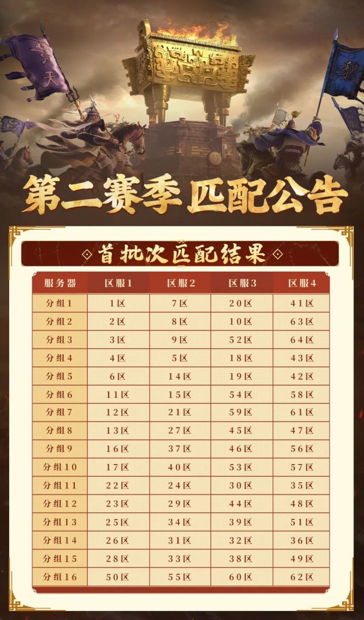 各位主公, 《偃武》首批次第二赛季匹配结果已出,请查收,并请合理规划游戏安排。具体结果和安排如下: 首批次匹配结果 1)在匹配期结束后,可在游戏里的赛季预告界面查看匹配公示结果;2)10月19日(周日)0:00开启备战活动,备战活动结束后,即将开启新赛季; 第二批次匹配预告1)以下范围的服务器范围被划分为同一区段:65~76区;2)同一区段的服务器,将在匹配时根据