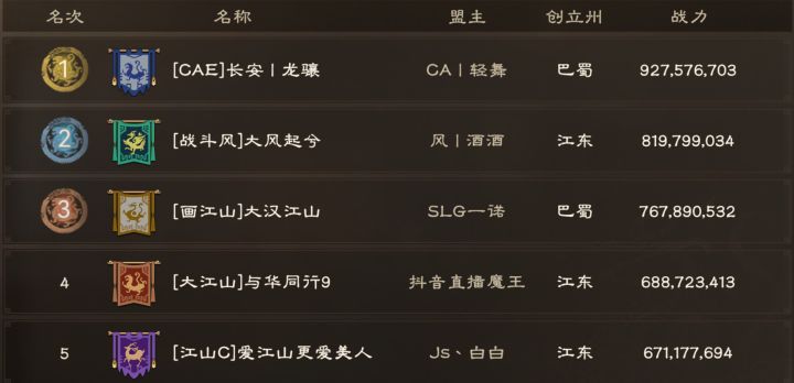不知昨夜多方混战,诸位主公打得可还尽兴,吃瓜的feel儿爽吗?错过的不要紧,相关战报阿武已经在紧锣密鼓制作当中,大家可要多多关注!位于江汉的两座3级城将于今日20:00准时解锁,前两名占领的同盟,将会获得3000元军费!接下来阿武先带大家看看各大联盟的备战情况。截至今日12:00,同盟战力排行第一是总战力9亿出头的【CAE】,看来突破10亿指日可待;昨日勇猛出关的【战斗风】也有着8亿多战力,实力
