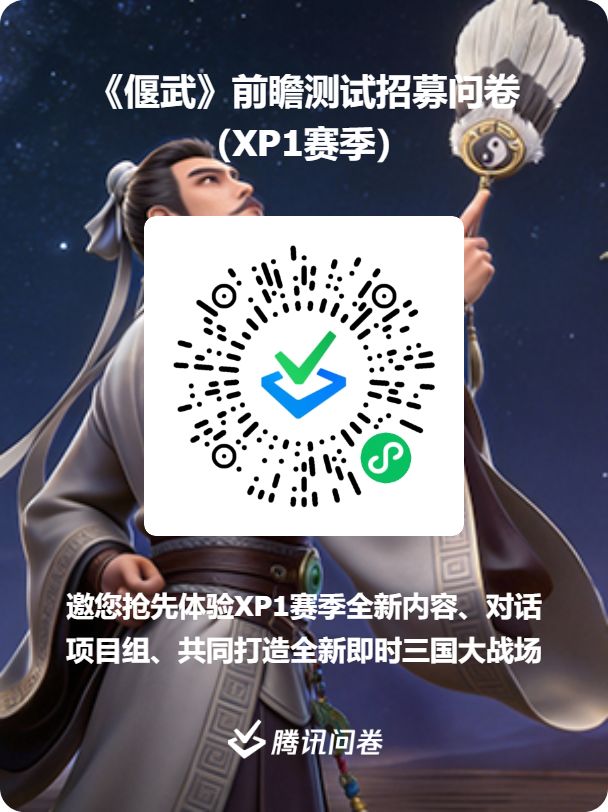 各位主公好!为迎接即将到来的XP1赛季,我们将诚邀一批热爱《偃武》的核心主公加入前瞻服,抢先体验全新版本内容。您的每一条建议,都将助力我们打造更完美的三国战场!【招募时间】申请时间:即日起 — 2026年1月26日23:59资格通知:2026年1月27日,我们将通过游戏内邮件向入选的主公发放通知前瞻服开放:2026年1月30日 — 2026年2月1日【如何申请】点击图片、扫描二维码或点击文末