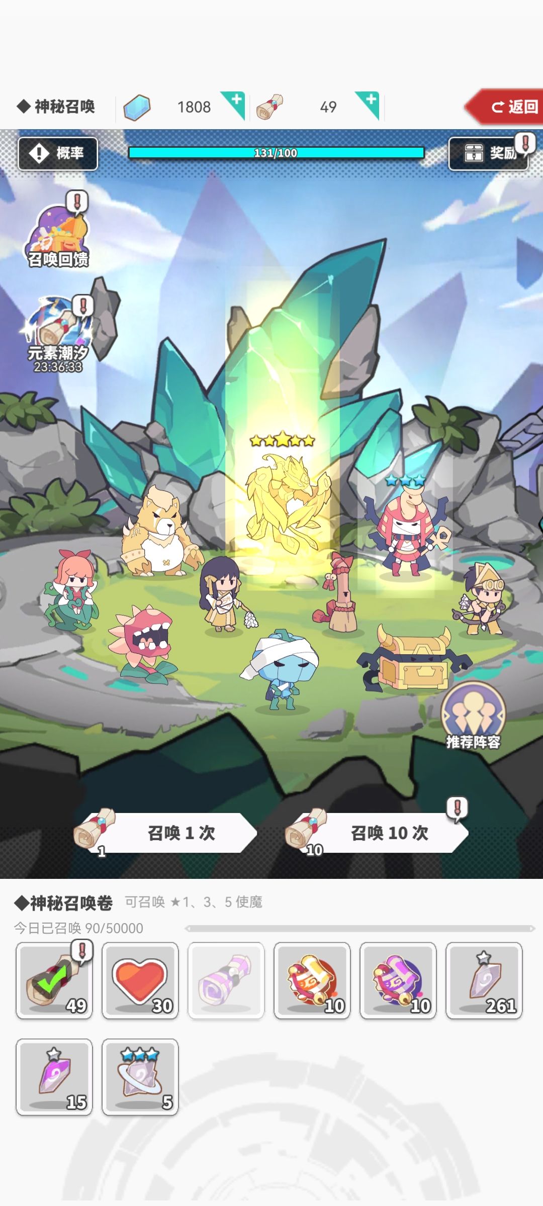 1.周活动道具 使魔的月活动流转一般会有四个固定的周活动和一个特别的占卜活动组成,也就是这五样活动道具一定要留到对应的活动日再用。(占卜每日有一次免费,记得抽一次) 道具使用时,要根据当月囤积道具数量进行抉择,拿【圣约召唤】活动为例,攒下的活动道具不够完成整轮时,根据回馈完成对应奖励积分即可,剩下的道具囤到下次活动再使用,否则每次都用个精光,会导致始终完不成整轮。当然,如果你抽取的兑换道具正好差一