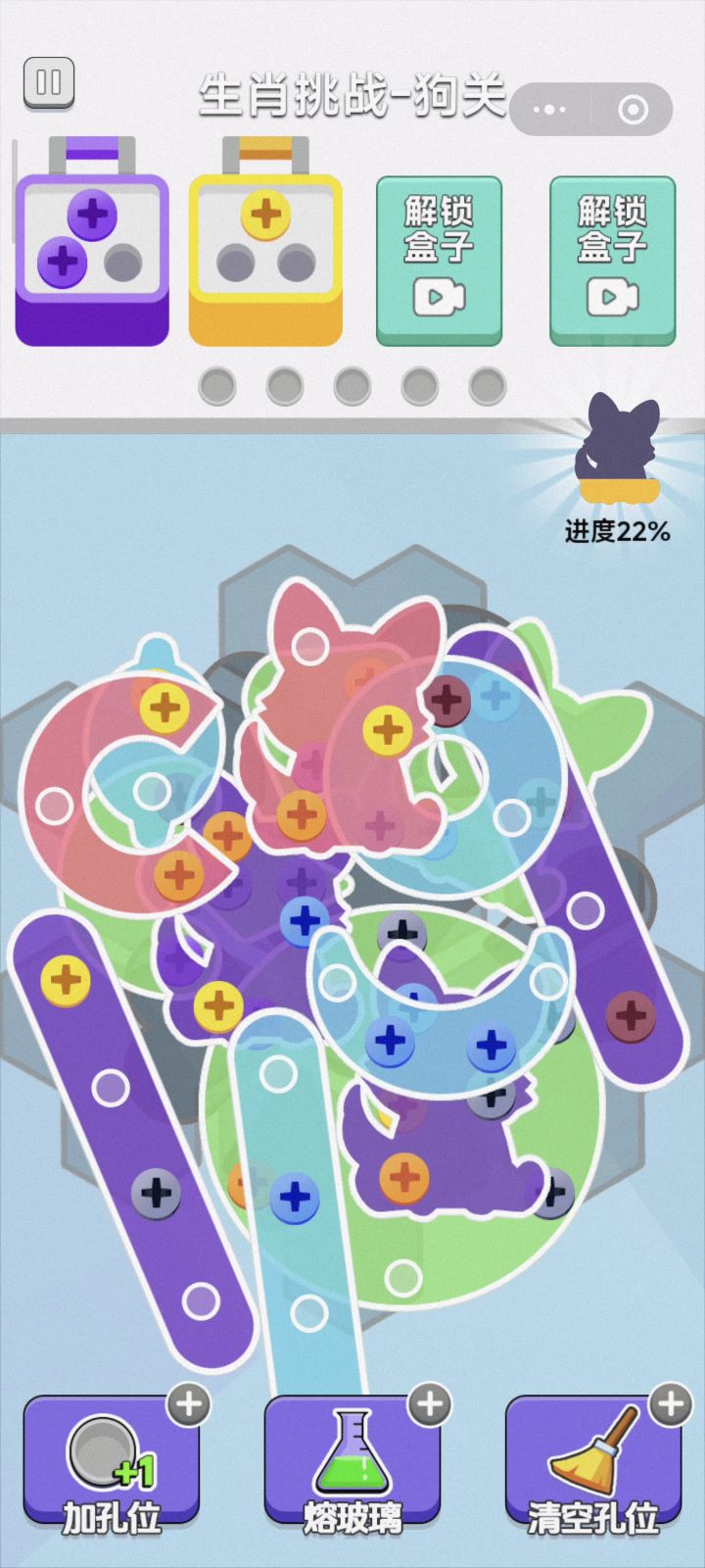 游戏描述:游戏的玩法就是将对应收纳盒颜色的螺丝拆除,并装入收纳盒中,因为收纳盒是随机出现,所以螺丝的选择至关重要,不能胡乱选择,这个是通关的关键