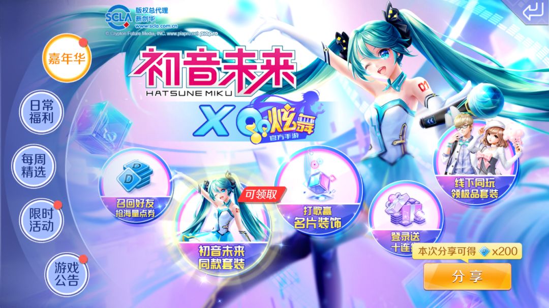 开心开心开心!炫舞手游刚刚过完满月庆,师兄就拿出了全新版本,还带来了电子歌姬初音未来加入炫舞世界,此时此刻,怎能让66不激动ヾ(✿゚▽゚)ノ 更重要的是,未来歌姬的加入还带来了超多福利喔,小主人们赶紧跟随66一起看下全新版本都有哪些福利吧~ 首先,进入游戏后小主人们就会在大阳台邮箱里收到66奉上的666点券福利!嫌少?大礼包随后就到… 初音未来X炫舞 嘉年华活动 福利1:登录送极光十连抽 小主人们