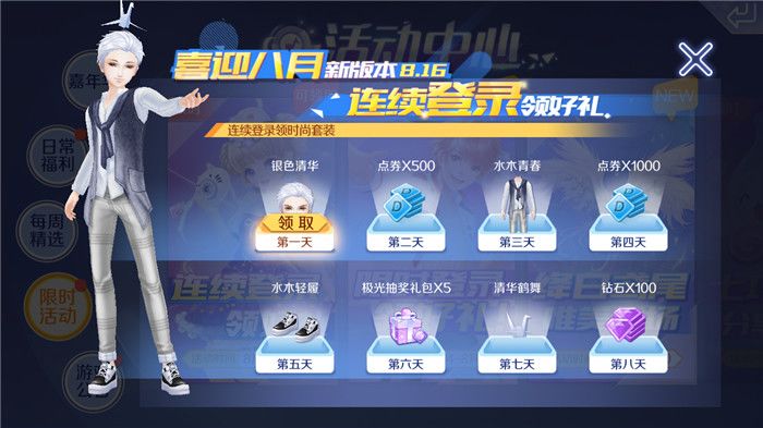 连续登录新版本 服饰钻石免费得 在八月新更新的QQ炫舞手游版本中,不仅增加了很多好听的歌曲和精美的服饰,我们还为大家新增了百人打榜玩法,可以在舞蹈中充分展现自己的实力和水平,与其他游戏玩家一决高下。在新版本当中,我们也为大家带来了新的福利,下面我们一起来看一下吧! 在更新了八月新版本后,玩家登录游戏时,系统会自动跳出来“喜迎八月新版本,连续登陆领好礼”的活动,通过连续登陆游戏,可以依次领取相应的奖