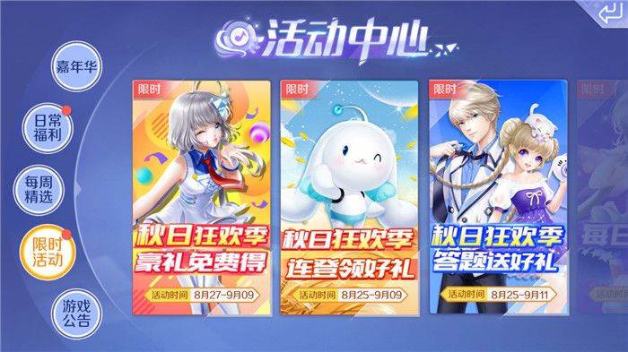 秋日狂欢季 豪礼免费得 在QQ炫舞手游秋日狂欢季的系列活动中,游戏为大家更新了新一轮的百人打榜活动,还为大家开放了地狱答题的新玩法,还有很多秋日狂欢季的系列活动与奖励,比如连续登陆领好礼、豪礼免费得等活动,下面我们一起来看一下,在秋日狂欢季中,豪礼免费得的活动如何参加吧! 玩家在8月27日至9月9日活动期间登陆QQ炫舞手游,可以在活动中心的限时活动页面中参与“秋日狂欢季,豪礼免费得”的活动。活动一