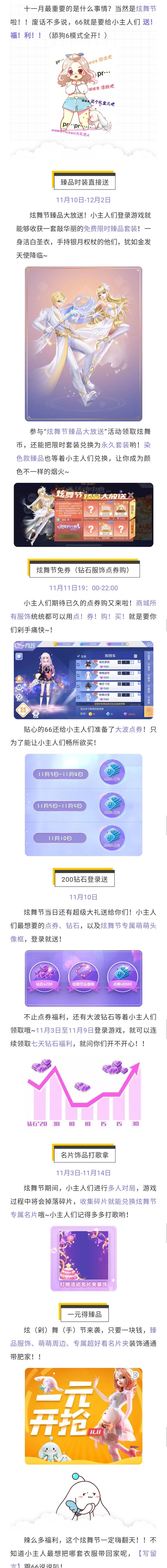 猴猴猴~随着星瞳生日会的结束,炫舞世界迎来了多姿多彩的炫舞节活动,趁着这次炫舞节的到来,66特意给各位舞者带来了首次免费的活动基金~是不是很惊喜,很意外撒(๑˙❥˙๑)憋说话吻我~ 走过路过,千万不能错过,66接下来要给各位舞者大大划重点了! 舞者们在11月10日-11月11日 任意一天登录游戏,即可领取到200钻石的活动基金,并可在接下来的两个周末登陆游戏领取各100钻石的奖励!(即11月17日
