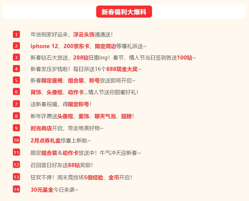 超重磅、超劲爆的五大新春猛料来了!小主人们可别错过,快跟66一起康康! 01 送新年限定头饰浮云 新年福利第一波猛料来啦!小主人们的首批“年货”66即将为你们派送~ 2月4日-2月17日期间,来参与年货到家好运来活动,完成指定任务,即可将新春头饰&牛年限定浮云带回家啦! 美美的头饰、浮云就等你来拿!这波福利66先送为敬~ ▲新春头饰 ▲牛年限定浮云 02 壕礼年货大奖派送啦 新春第二波福利猛料来噜