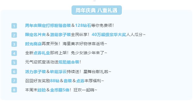 冻...冻死66了!最近的天气虽然很冷,但是周年庆典却在热热闹闹地布场中,只为了给咱们小主人留下一个完美难忘的周年狂欢记忆~ 在温暖厚实的小被窝里蹬了半天小短腿的66,也挣扎着起床了!别问俺为啥大冬天的还要出门,问就是为了给小主人们置办周年庆限定打标粉臻、128钻石、限定翅膀、亲子装的满满福利! 限定粉臻钻石 周年狂欢放送 噔噔噔噔!公测两周年,大礼倾心送!为了感谢小主人们两年里不离不弃的陪伴,6
