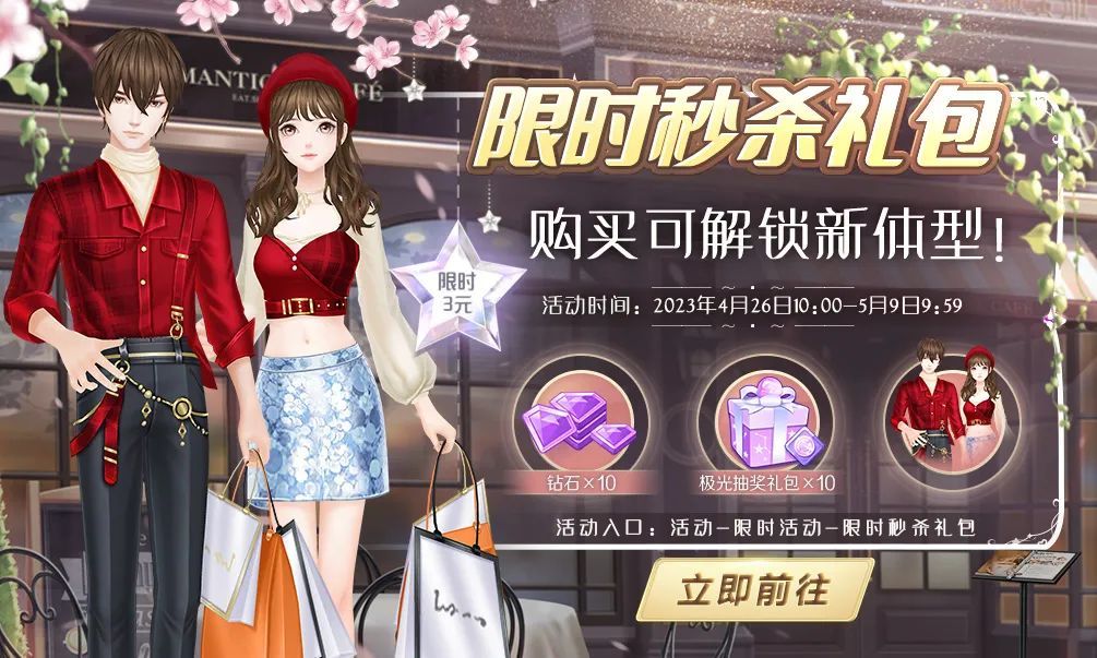 马上就是五一假期了,66我呀,恨不得咻得一下飞到假期当天! 假期都要来了,福利和美衣当然少不了!限时秒杀礼包3元购,超凡/臻品套装返场得!简直是爽歪歪~ 01 限时秒杀礼包 限时优惠,不容错过!2023年4月26日10:00至2023年5月9日9:59期间,仅需3元即可把限时秒杀礼包拿下! 入口:活动-限时活动-限时秒杀礼包 限时秒杀礼包内含蜕变体型轻奢组合装-购物红运、钻石*10、极光抽