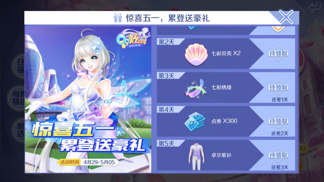 时值五四青年节,各位小主人是不是心情愉悦、活力飞扬呀,时光总在大家毫无准备的时候悄然离去,提醒着我们,青春就是要炫动起来! 还等什么,赶紧加入炫舞世界和66一起舞动青春吧!5月浪漫季,小主人们累计登录就送专属套装~ 累登送豪礼(4.29-5.05),小主人们活动期间每天前往【活动-嘉年华】登录领专属套装页面领取奖励: 登录第1天,可获得点券*100奖励 登录第2天,可获得七彩贝壳*2奖励 登录第3