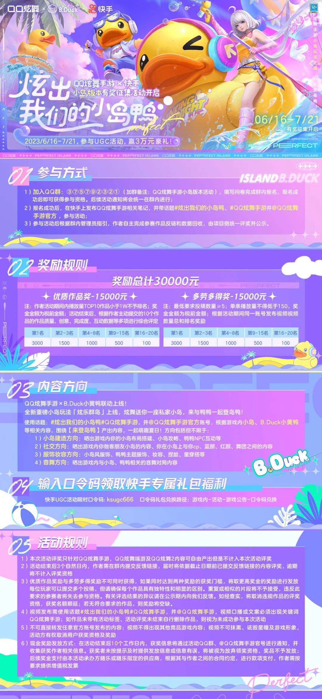 小岛版本内容征集活动 全新玩法-炫乐群岛已经在6月15日上线啦,小主人去体验了吗? 今天66还带来了全新内容征集活动,快来炫出你们的小岛,赢取丰厚现金奖励~ 活动时间 6月16日至7月21日 参与方式 活动期间,加入QQ群375792321,填写问卷完成群内报名获得参与资格。报名成功后,在快手上发布“QQ炫舞手游”相关笔记,带话题#炫出我们的小岛鸭、#QQ炫舞手游并@QQ炫费手游官方即为成功参与活