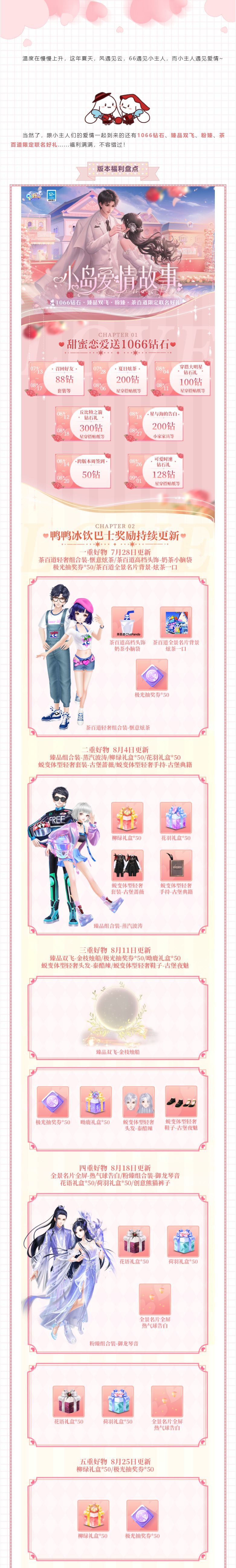美衣集中返场 从明天(7月25日)10:00开始,玄雾华影&星空乐章将返场【幸运邮轮-精选返场-礼盒精选】中! 同时,星空独角兽&恋爱魔咒&海风轻柔也将返场【幸运邮轮-精选返场-甄选返场】中!喜欢它们的小主人不要错过啦~ 不是夏日限定,是来日方长~ 属于我们的小岛爱情故事要开始啦~来下方【写留言】和66聊聊你的爱情故事吧~ 对啦!别忘了今晚(7月24日)19:00来观看新版本内容前瞻直播哦! 预约