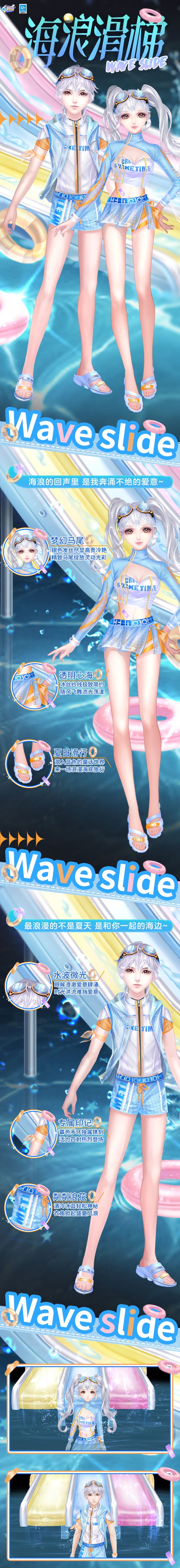 前往海洋游乐场 乘坐掀起浪花的滑梯 挥洒快乐能量~ 缤纷滑梯 女孩小心翼翼的坐上糖果色的滑梯,感受海浪席卷的快乐~ 男孩登上滑梯,尽情一跃,感受速度与激情的魅力~ 海浪乐园 女孩顺着滑梯滑行,男孩在尽头守候,小心翼翼地接住她。 女孩趁其不备朝他泼水,是两个人快乐的打水战~ 逐梦魔法屋奖励更新 魔法屋奖励更新啦,奖池中的蓝海之魄、幻象之尘、惊鸿之羽将会同步更新为烟花道具-璀璨文字烟花/蔚蓝文字烟
