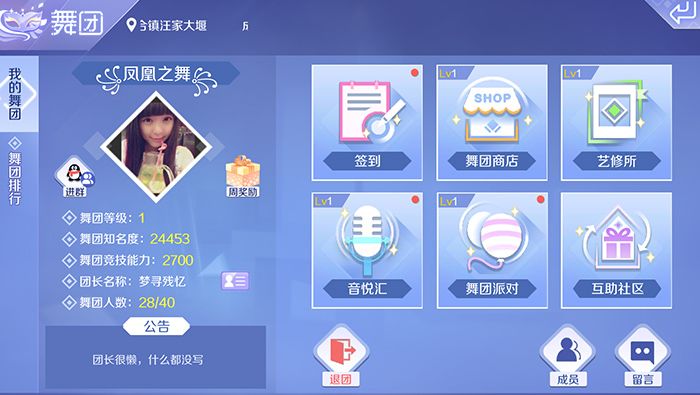 小主人们,在QQ炫舞手游里舞团是不得不体验的玩法,舞团可以让小主人们结识更多的小伙伴,更包含了签到、神秘小店艺修所、音悦汇、舞团派对、互助社区等众多功能,小主人们不仅每日都可以参与,还可以兑换到精美的服饰奖励哦~ 在达到26级后,小主人们就可以解锁舞团玩法啦,随后就能选择加入、创建舞团,来体验到舞团中的这些新玩法~ 舞团签到 舞团签到是最基础的功能,小主人们进入到舞团后每日都可以进行签到,成功签到