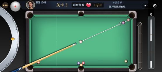 开心台球之残局闯关,新人必看教学攻略! 本期小编为大家带来的是开心台球残局闯关第二关 由于小伙伴们的反馈,我们将残局闯关难度大大降低, 从之前的一杆清台,现在改为了失败后扣除剩余杆数,杆数用光即为挑战失败。 第二关的整体布局和第一关类似 本关我们有10杆的机会,而台面上的球基本都停留在洞口。 我们先从3号球开始起手,虽然瞄准线很短但是也足够我们使用。 我们可以选择大力击打,母球撞击