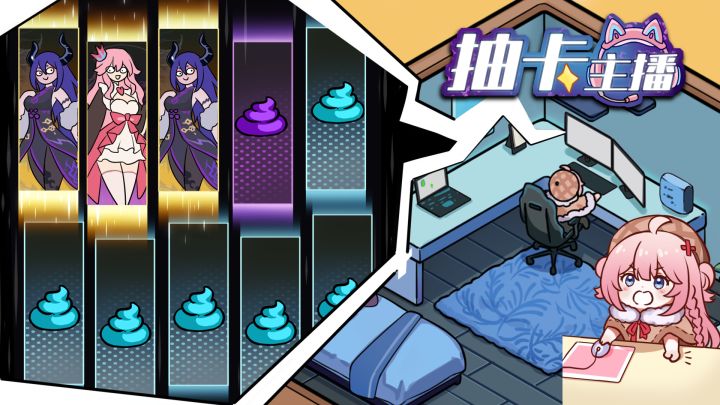 🌸游戏名:抽卡主播 🌸游戏类型:模拟/养成/休闲 🌸游戏状态:预约中 ✨✨✨✨✨✨ 🌼Hi,我是拆卡主播七七,欢迎大家来到我的直播间,这边“猿神”“破晓无间”等热门游戏的抽卡各位老板可以看一下~🌼这个“不会唱跳RAP”的老板在吗,在的话扣个1,七七要开抽啦!🌼这个老板好像不在,晚点给他抽吧,下一个🌼这个“七七铁粉”的老板在吗,在的话扣1,好的,那我现在给你抽!🌼恭喜老板抽中“草神”