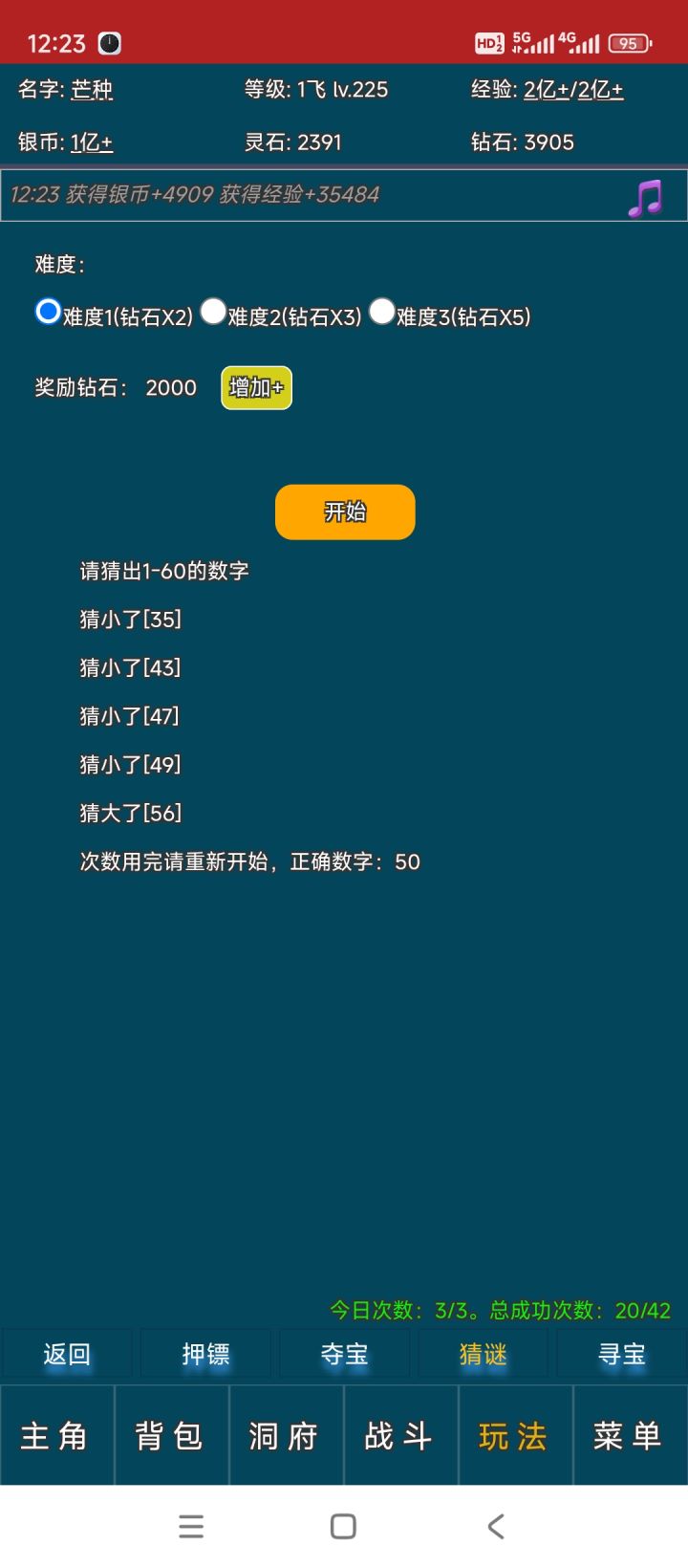 经典8421法,选一个16到45中间的数,猜大就-,猜小就+,数值依次是8,4,2,1。然后可以加钻石,第一次+100,如果错了,那么第二次+200,第三次+400以此类推,直到对了又从+100开始。但如果你连错10次那感觉没有玩这个游戏的必要了。