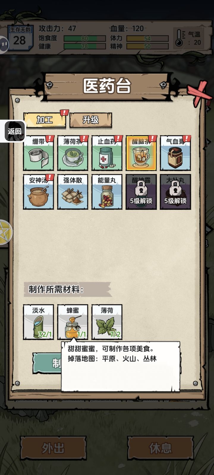 : 刚试过睡觉前有饱食度就不影响第二天,睡前吃个低饱食度食物,这游戏食物需求很低,获取最慢的是动物皮毛,筋,需要战斗,前期容易得但健康不够,中期怪就非常猛了能打过的很少。