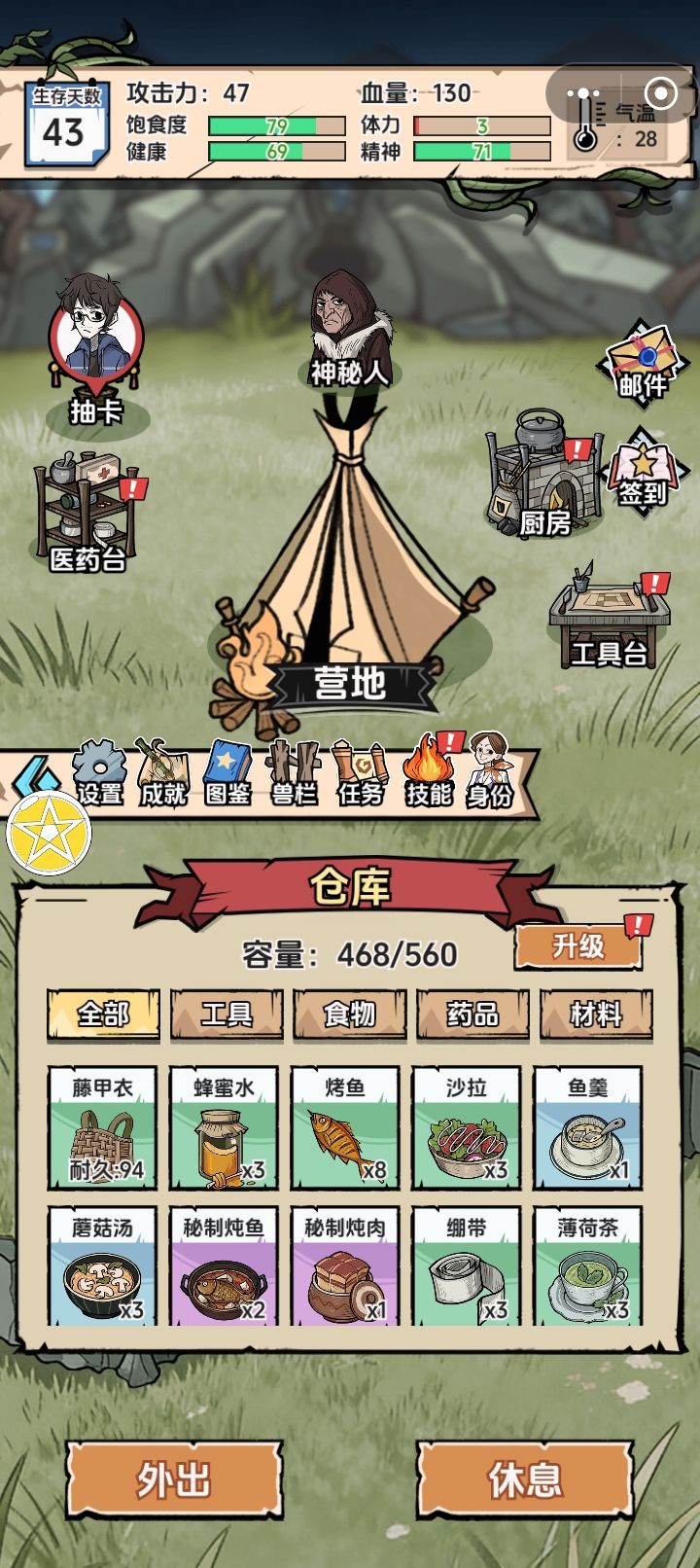 1.加入了抽卡,挺好玩的,而且显著降低了生存难度,不看广告也完全能玩下去 ,这点还挺良心的(尤其是挖矿掉率很高,如果不是为了抽橡胶,很快就能攒下一二百个石头),不过后期为了数值爽(囤货玩),我还是看了几个广告支持一下。