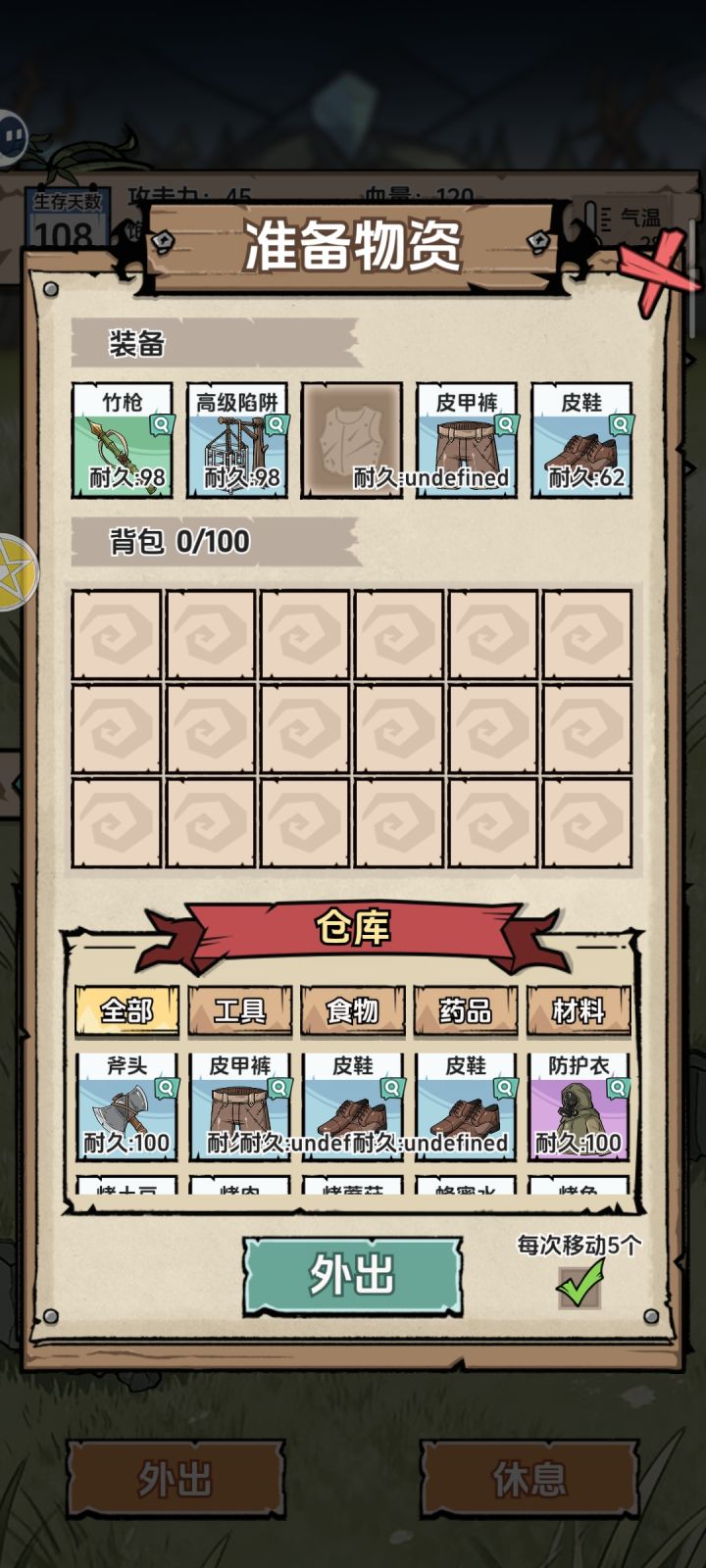 问题是升级各种建筑都要兽皮,皮甲都要,55天了一个动物都打不死,就算用陷阱也只扣20~30血还是要打,前几天不去打十几血的后面动物全是几百血十几血的直接绝种,玩到50天后直接无聊死不是找吃的就是做吃的,结局就是要抽卡抽到船的各种零件制作船才算结局,就是一直循环找吃的找抽卡找吃的找抽卡←没错后面全程就是这样