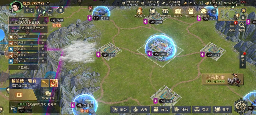 玩法:就是一个国家,不停的占领地图上的城镇关隘,和其他国家竞争,一直打到皇城称霸,地图上玩家没有主城个体,而是玩家迁居到地图上的各个城镇,由此为出发点扩张,不过玩家有城镇建筑,可以提供各种增益效果 抽卡:武将目前不是很多,不是r/sr/ssr/ur的分类,而是用8/10/13/15/18/20资质来分,基本上平民主用的都是13和15资质的武将,可以用心愿单,也有极低概率可以直接抽到18资质的武将,