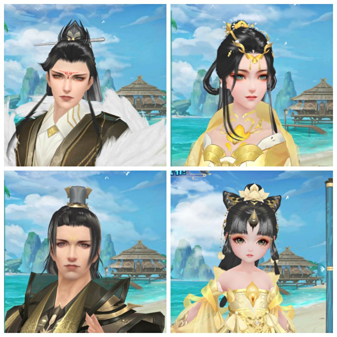 【云歌】>>> 成男瞳孔为黄色,眉间有红色花钿;成女瞳孔为绿色,红色眼影;壮男银色瞳孔,眉间为剑形状的黄色花钿,有点像藏剑的图标;萝莉则是碧色瞳孔+暖橘色眼影,下眼睑有亮片点缀。 【素心】>>> 成男的瞳孔为蓝色,成女黄色,壮男浅蓝,萝莉灰色打底+紫色高光。 【问情】>>> 四个体型都很清新雅致,只有萝莉在腮红上做了小设计,一如既往的可爱。 【红莲】>>> 成男和壮男都有那么一丝走火入魔的意思,眼