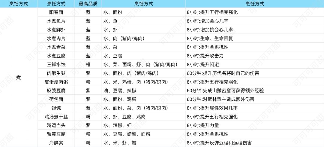 基于最初版本的菜谱,这次的更新版本加入了对猪肉和鸡肉的分类,更方便了小可爱们去制作菜品。 一、煮系列 二、炖系列 三、烤系列 四、炸系列 五、蒸系列 六、食材产出地 绝品食材坐标:可甜攻略|紫色品质绝品食材坐标大全 七、门课菜谱(图源墨遥) 八、活动菜谱