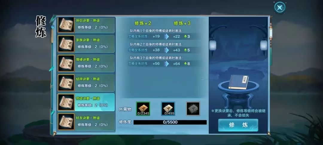 更新后阵法系统分为三层,外层是旧版阵法系统内的六本关系诀要,中层为新增的五行诀要,内层为新增的阵法诀要。诀要升级需要消耗阵法修炼道具:阵法修炼精要+500修炼度、阵法修炼残卷+100修炼度。 一、关系诀要 ⭐️等级需求⭐️ 1阶关系诀要等级需求为80级,2阶关系诀要等级需求为90级。 ⭐️分类⭐️ 好友诀要、结拜诀要、家族诀要、侠侣诀要、情缘诀要、师徒诀要。 这六本诀要沿袭了上个版本阵法系统的生效