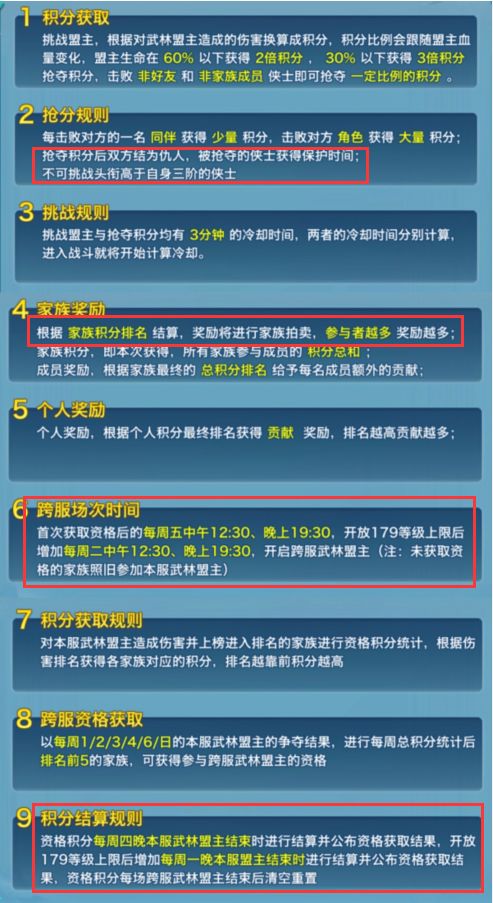 针对很多玩家对武林盟主活动问题出一期相关小攻略 先介绍一下活动规则 活动时间是每天【12:30-12:42】【19:30-19:42】 家族成员都可以参与(20级开放) 其中很多少侠最关心的就是如何获取积分最大化 首先明确一下,我们在活动中最多可以四次挑战积分以及三次抢分 四次挑战时间分别是:倒计时【10:50】一倍,【7:15】二倍,【3:50】、【0:45】三倍 三次抢分分别在四次挑战冷却期间