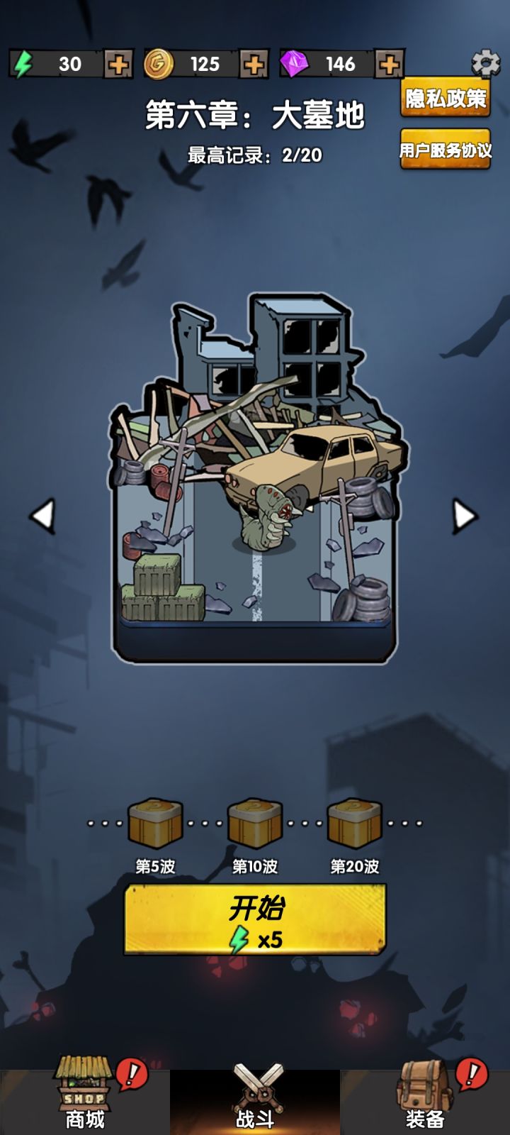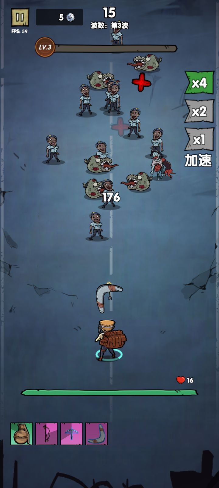 整体大同小异,竖版战斗场景与主界面关卡章节界面布局,趋同于《背包勇者》《向僵尸开炮》等小游戏,唯一不同的就是主题包装,游戏内僵尸出场方式与土豆兄弟相似,会先显示有红X再出现,以此来预告怪物密集程度,然而其余图标素材风格迥异,例如写实风格的弓箭,与略微Q萌的回旋镖,大小比例不对等,而简单叠加生成的章节小图,更令显得拼凑感十足,缺少专业的美术设计感...