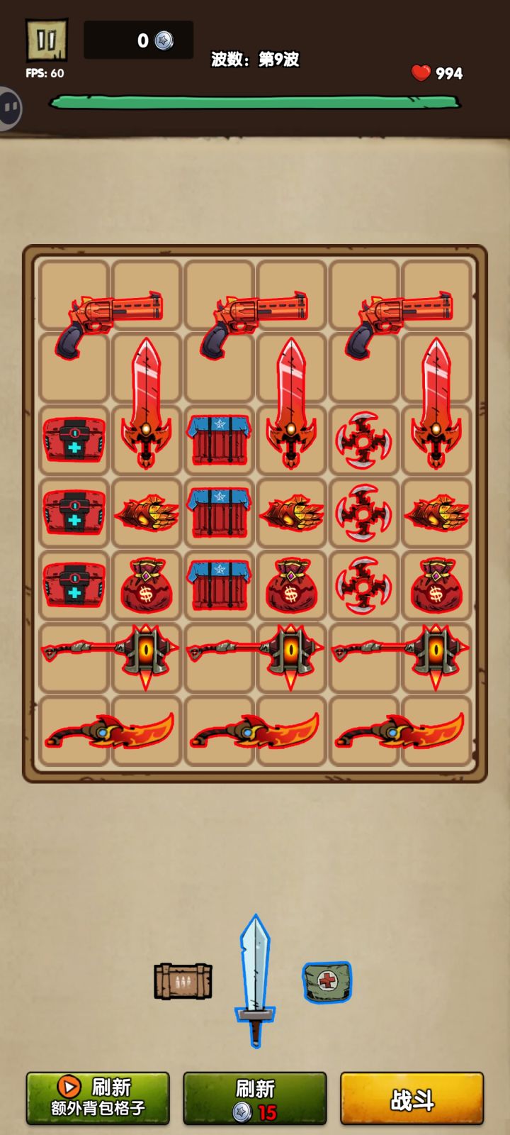 选择6把武器上阵,根据背包空间塞入各式武器,关卡内每波战斗后可刷新3件物品,两两相同便可合成升级:白→蓝→紫→红,合成上限为3次,间接限制了关卡内输出上限,将部分武器数值放于场外卡牌抽取与升级;