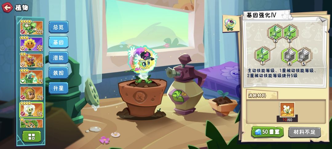 咱们言简意赅,言归正传: 植物升级到四星,可以解锁潜能系统,可以给植物随机增加5种属性(图2),增强植物。而99%的玩家第一个升级四星的植物多数是蒲公英、赛季植物等攻击类植物,殊不知都是错的[表情_泪目]第一个升级四星的植物应该是向日葵[表情_看我的]原因如下: 首先轻松过关条件=要有充足的阳光也就是说要有充足的资源。 这一点不论是以前的星际争霸,还是王者荣耀只要有经济有资源,就可以做到碾压,轻松