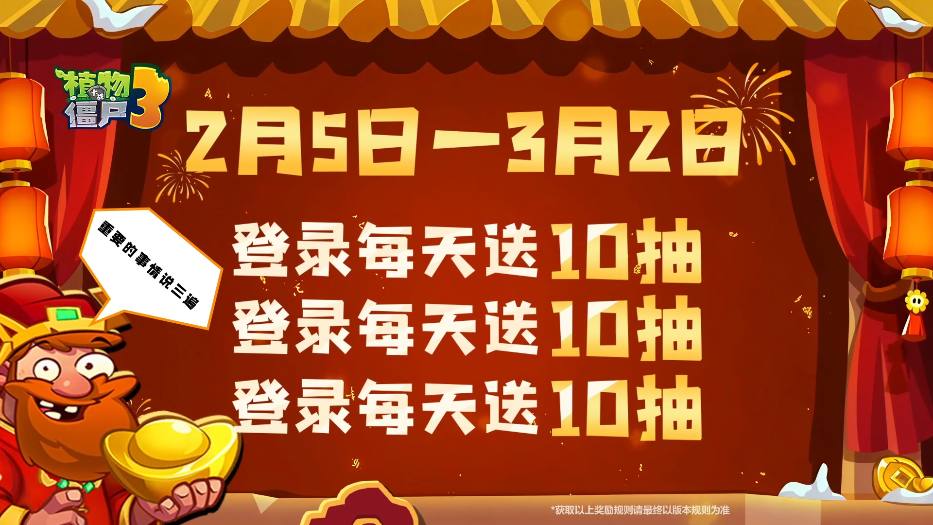 2026新年新惊喜! 2月5日-3月2日,每日登录送10抽! 限定头像、大哥装扮、刺梨全服免费领! 还有植盒劵钻石棱彩宝石等好礼送不停! 老玩家回归福利、新玩家福利齐登场! 猫尾草、槲寄生新春商店限时返场! #植物大战僵尸3正式上线 #植物大战僵尸3 #植物大战僵尸3首发激励 #pvz #pvz3 #植物大战僵尸3新春真香