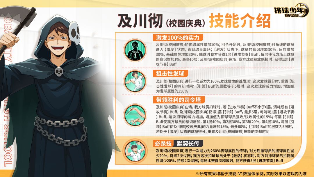 【及川彻(校园庆典)】 稀有度:SP 定位:二传手(S) ▷▷卓越招募时间:2025年10月23日维护后 ~ 11月5日23:59 【技能介绍】 一技能:激发100%的实力 及川彻(校园庆典)的传球属性增加;回合开始时,及川彻(校园庆典)对角线的球员进入【激发】状态,直到球员离场;【激发】状态下,球员的意识增加,反应增加,基础属性增加,触球时我方获得【进攻节奏】Buff,每层使我方场上球员意识
