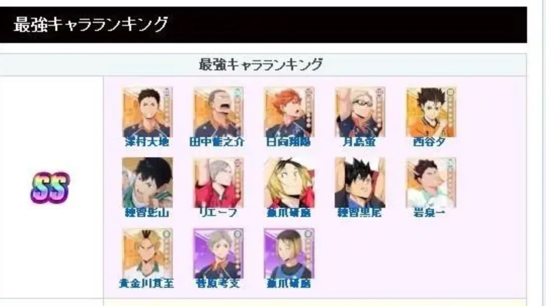 大家好,希望本篇攻略能帮助更多新人入坑,祝各位都能一发入魂! 话不多说进入正题 下面是相关角色的节奏榜(根据外服玩家整理得出,不代表国服版本,仅供参考!) 球员强度是多维度的,排名高低不代表真的不能练,如果你有别的想法,那么一定是你对! 我们先参考日服和台服两波玩家给出的强度排名 日服 台服 针对同时出现在两个榜单的球员,作出详细的推荐理由 >>S级 日向:十分强力的攻击特化MB(副攻手),每个被