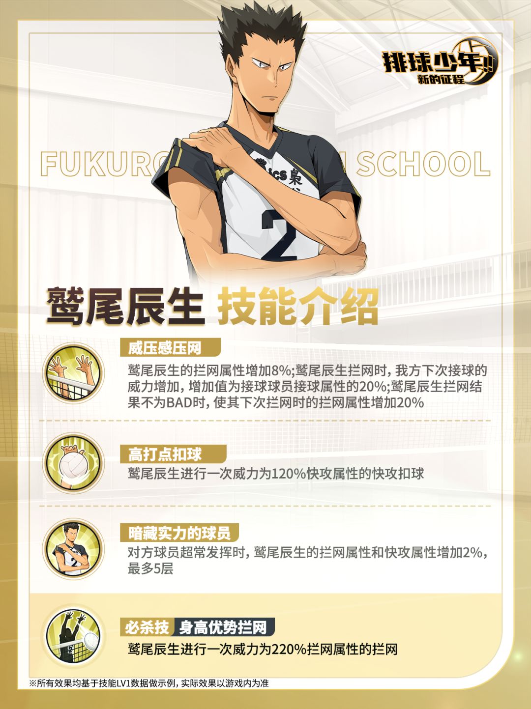 【鹫尾辰生】 稀有度:SSR 定位:副攻手(MB) ▷▷活动招募时间:2025年1月23日8:00~2月19日23:59 【技能介绍】 一技能:威压感拦网 鹫尾辰生的拦网属性增加;鹫尾辰生拦网时,我方下次接球的威力增加;鹫尾辰生拦网结果不为BAD时,使下次拦网时的拦网属性增加。 二技能:高打点扣球 鹫尾辰生进行一次快攻属性的快攻扣球。 三技能:暗藏实力的球员 对方球员超常发挥时,鹫尾辰生的拦网属性