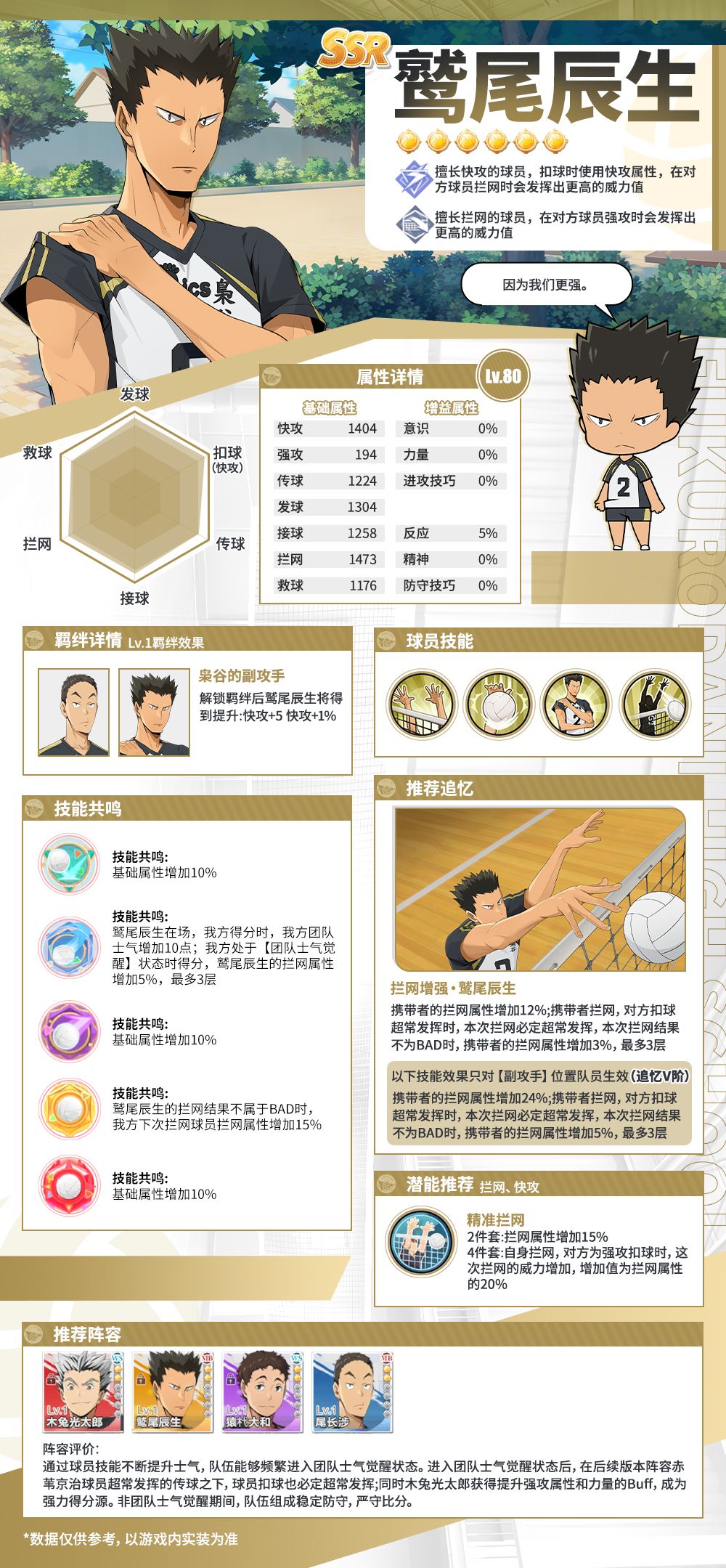 🏐「鹫尾辰生」定位副攻手(MB)。 🏐擅长快攻和拦网的球员,扣球时使用快攻属性,在对方球员拦网以及强攻时会发挥出更高的威力值。 🏐潜能推荐:拦网、快攻。 ⭐更多「鹫尾辰生」养成详情,阵容攻略欢迎点击配图查阅。 #排球少年 #排球少年手游 #排球少年新的征程 #排球少年1025新的征程 #一起来玩排球手游