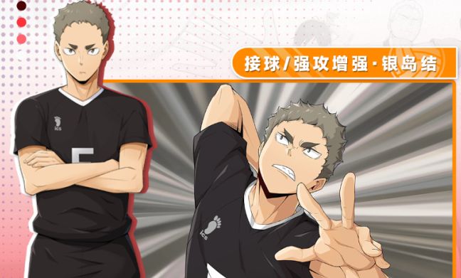 "在扣杀与接球的交界处,书写新的可能性。" 稻荷崎的三个SSR主攻手,北队是纯粹的接球,阿兰是纯粹的进攻,那么银岛结(以下简称阿银)就是兼顾了接球与扣球能力,拥有稳定的攻防能力。 在共鸣4的情况下,阿银拥有额外的21%强攻属性、21%接球属性、和至少4%进攻技巧(每个接球标签球员增加2%)加成,一级大招在后排也有255%的倍率,所以他不是“样样通样样松”,而是真的做到了在扣球能力不差的情况下,